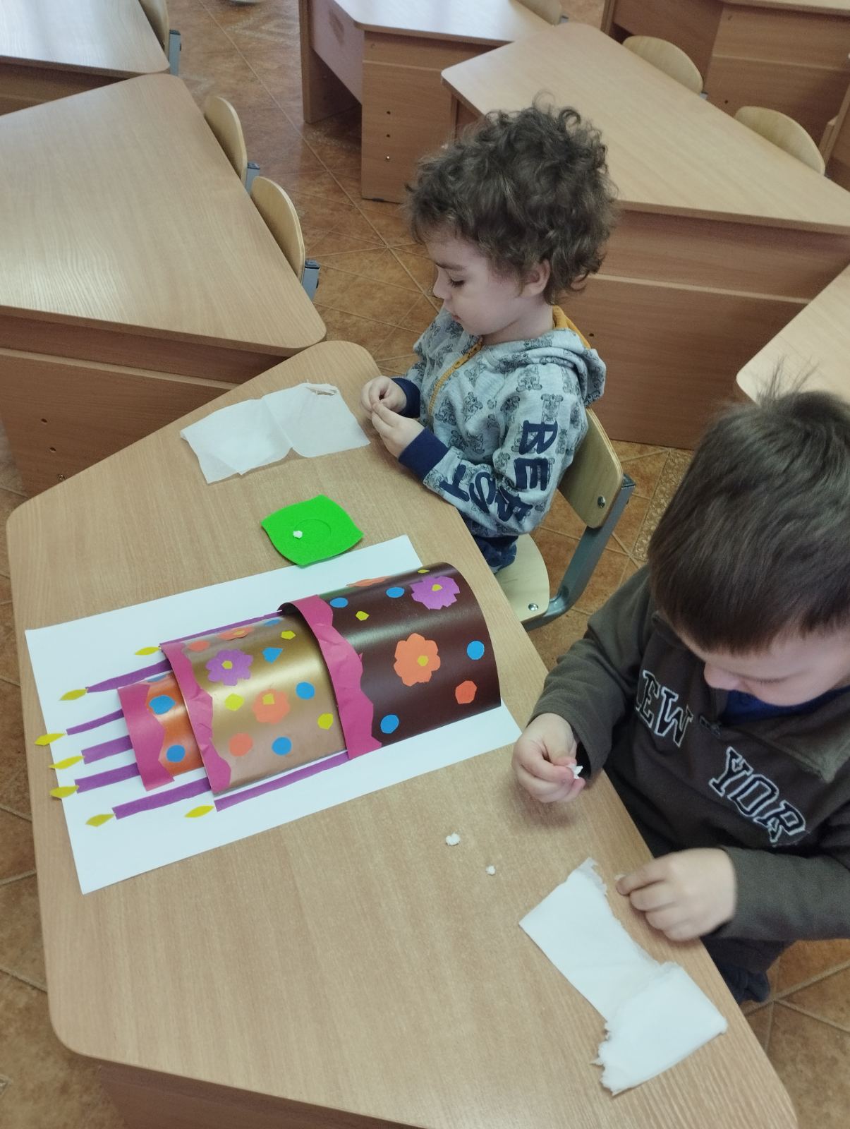 Программные задачи:Формировать умение вырезать по контуру ;Развивать умение составлять узор из вырезанных деталей;Воспитывать чувство сплочённости в коллективе.