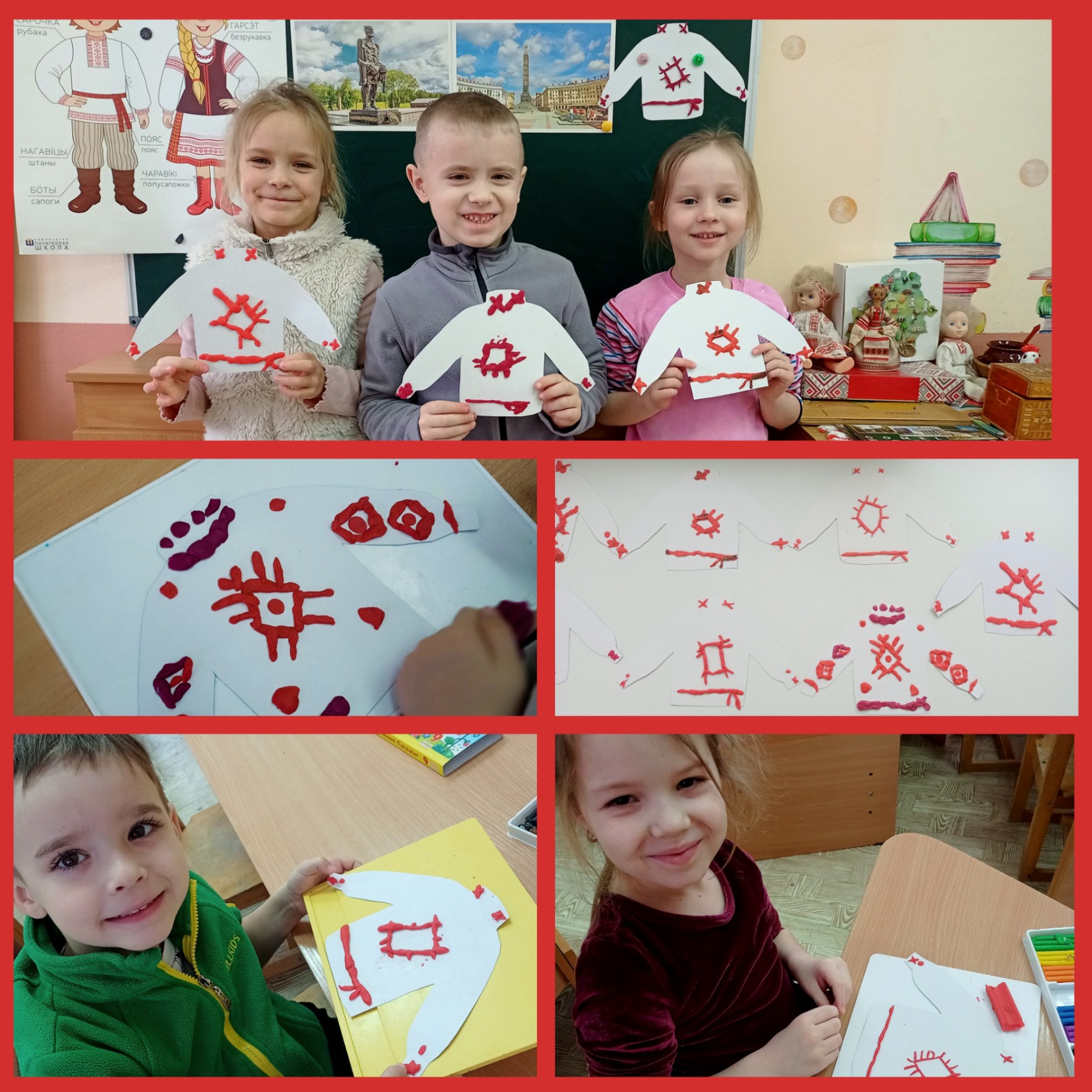 Праграмны змест: пазнаёмiць дзяцей з нацыянальным беларускiм адзеннем, яго каляровым спалучэннем; праз гульнi развiваць цiкавасць да вуснай народнай творчасцi, праз дэкаратыўную дзейнасць дзiцячую творчасць i павагу да працы; замацаваць веды пра адлюстраванне беларускага ўзору, геаметрычныя формы, колер; навык малявання пэндзлiкам; выхоўваць любоў да Радзiмы.